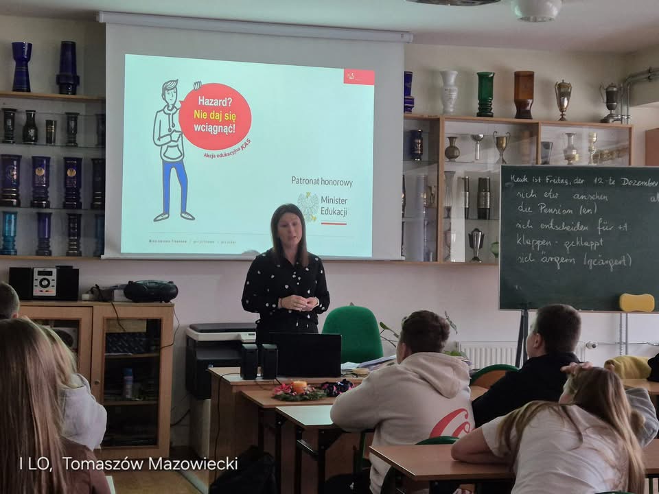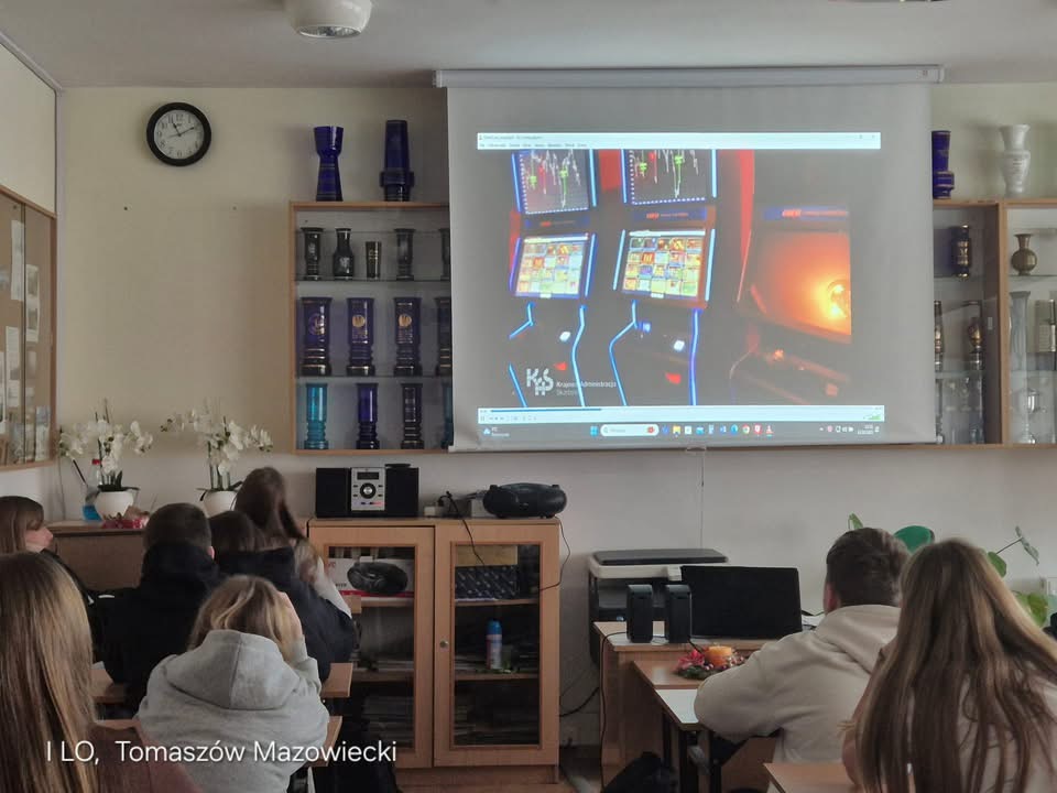 W klasach I B, I C i I D odbyły się spotkania profilaktyczne z przedstawicielką Izby Administracji Skarbowej w Łodzi Moniką Krawczyk pt. "Hazard? Nie daj się wciągnąć!". Uczniowie dowiedzieli się na nich czym jest i jakie niesie skutki hazard, jak go unikać oraz gdzie w razie uzależnienia szukać pomocy. W ramach spotkania uczestnicy wzięli udział w quizie sprawdzającym poprzednie spotkania z hazardem. Prezentację zakończył wywiad z uzależnionym od hazardu opowiadającym swoją historię.