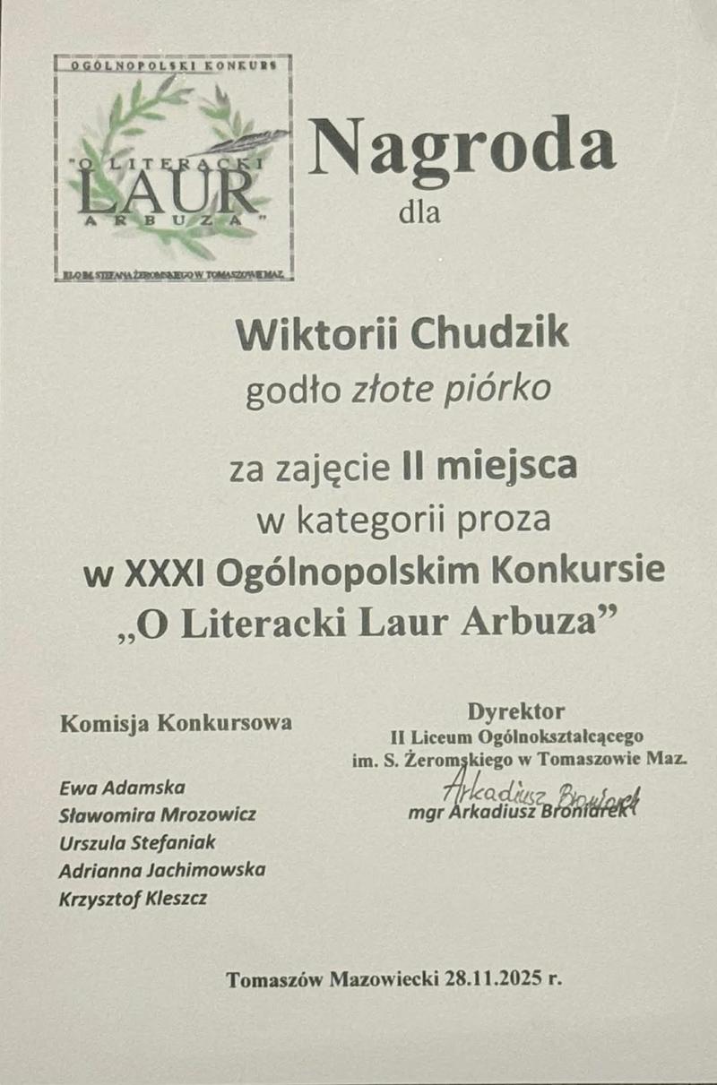 Z radością informujemy, że uczennica naszej szkoły - Wiktoria Chudzik z klasy 4D - zajęła 2. miejsce w kategorii proza w XXXI edycji ogólnopolskiego konkursu „O Literacki Laur Arbuza”, organizowanego przez II Liceum Ogólnokształcące w Tomaszowie Mazowieckim.