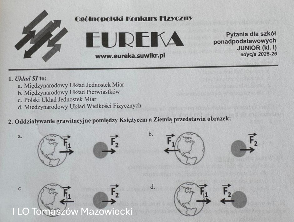 Tradycyjnie, w pierwszym tygodniu marca, uczniowie I LO przystąpili do Ogólnopolskiego Konkursu Fizycznego „EUREKA”. W tym roku w zmaganiach z fizycznymi łamigłówkami uczestniczyło 23 uczniów: 18 z klasy1A w kategorii Junior oraz 5 uczniów z klas 2A i 3A w kategorii Żak.