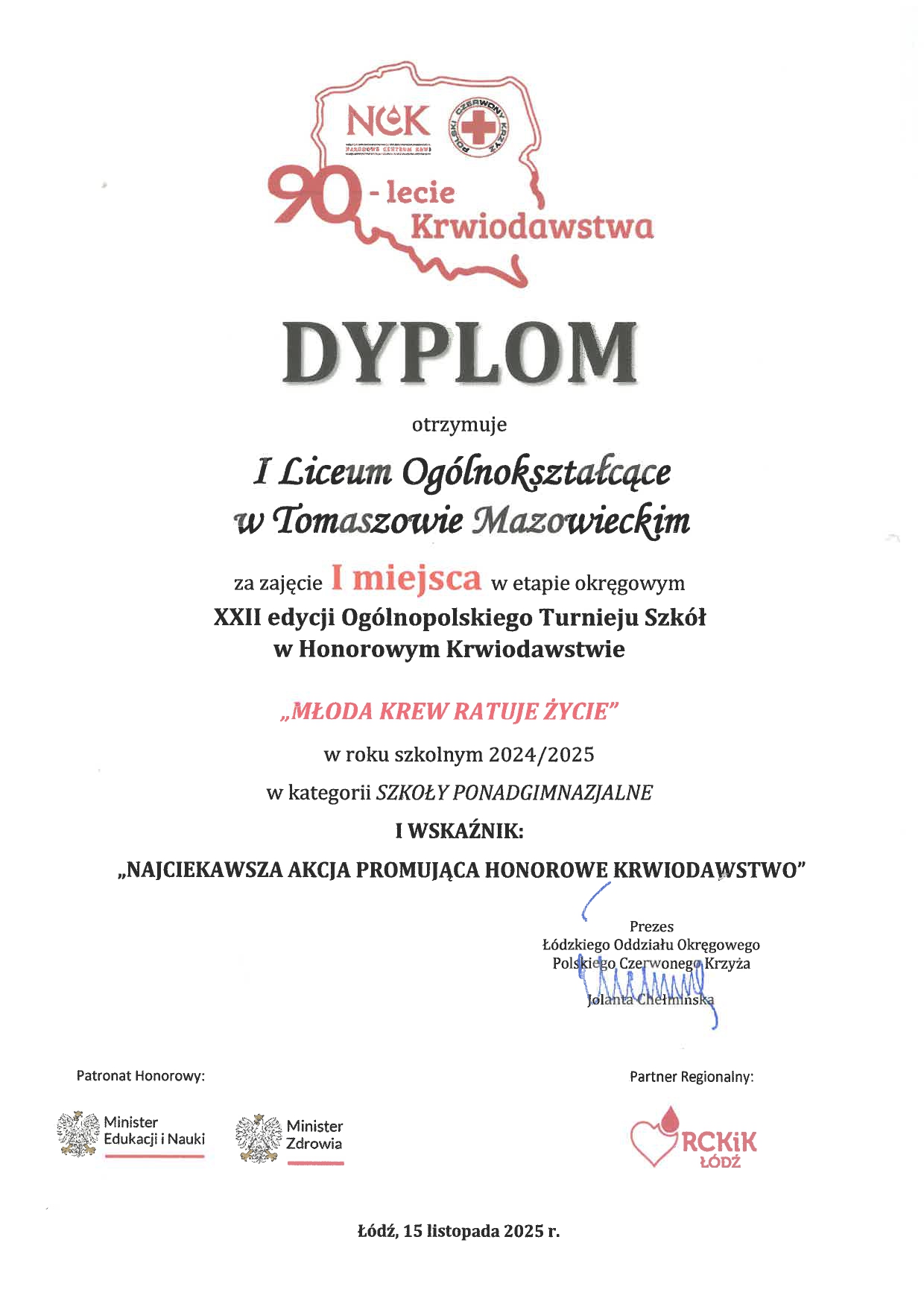 Z dumą informujemy, że zdobyli oni 1. miejsce w województwie łódzkim w kategorii - promocji honorowego krwiodawstwa.