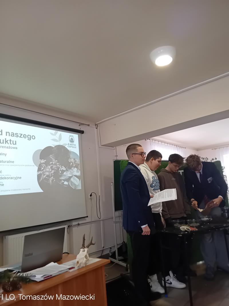 Uczniowie klasy I e zaprezentowali swoje produkty. Przedstawili pomysł, jego realizację, plany na przyszłość. Zwrócili uwagę na ekologiczne i edukacyjne walory swojej działalności.